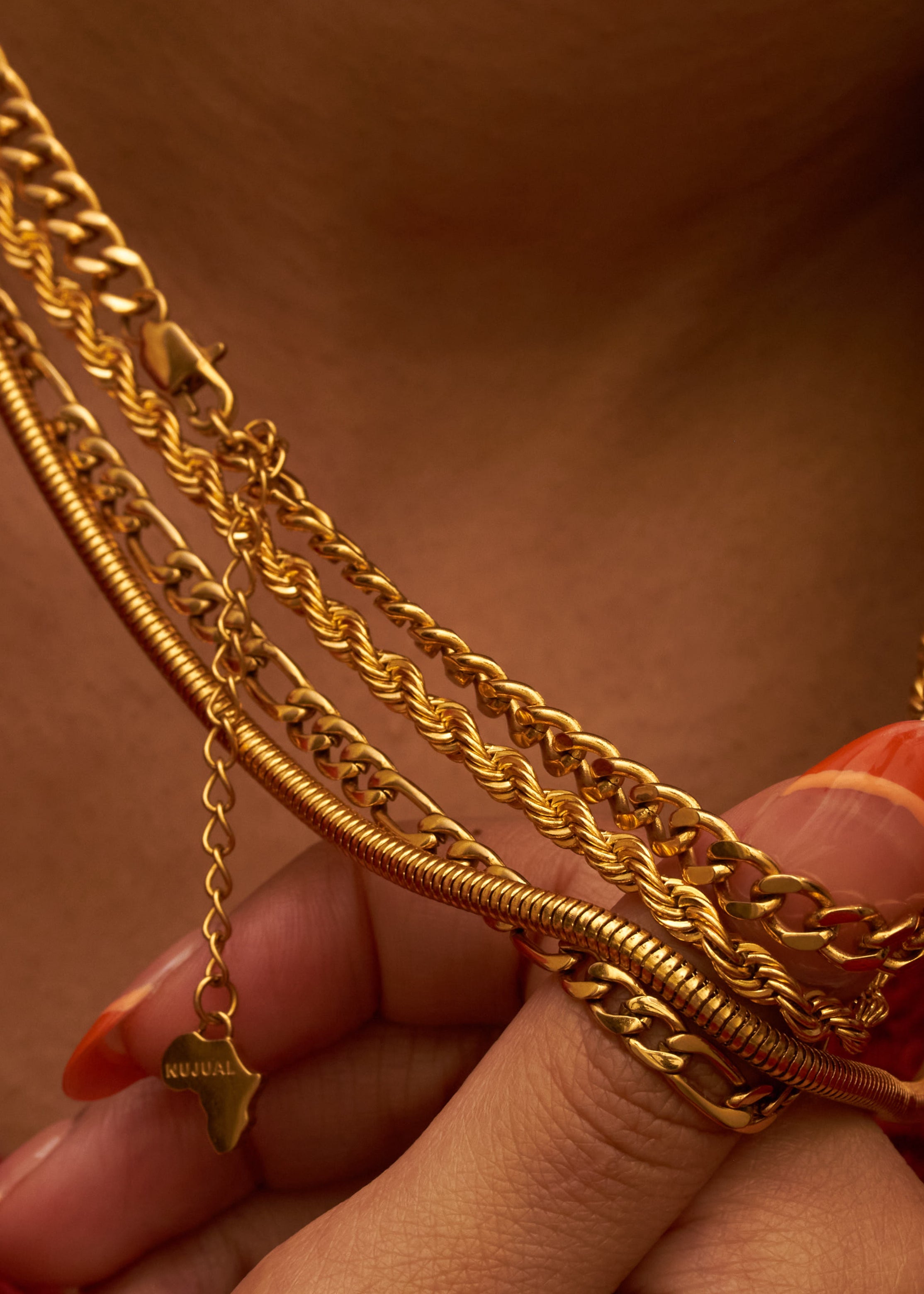 To continue the growth of NUJUAL we wanted to launch a line of classics. Opposite to our designer line which includes uniquely artistic pieces, our signature line includes everyday essentials that you can layer with or without our designer collections. Our first drop includes 4 different chain styles that come as necklaces and bracelets/anklets, each including our special Africa chain tag.