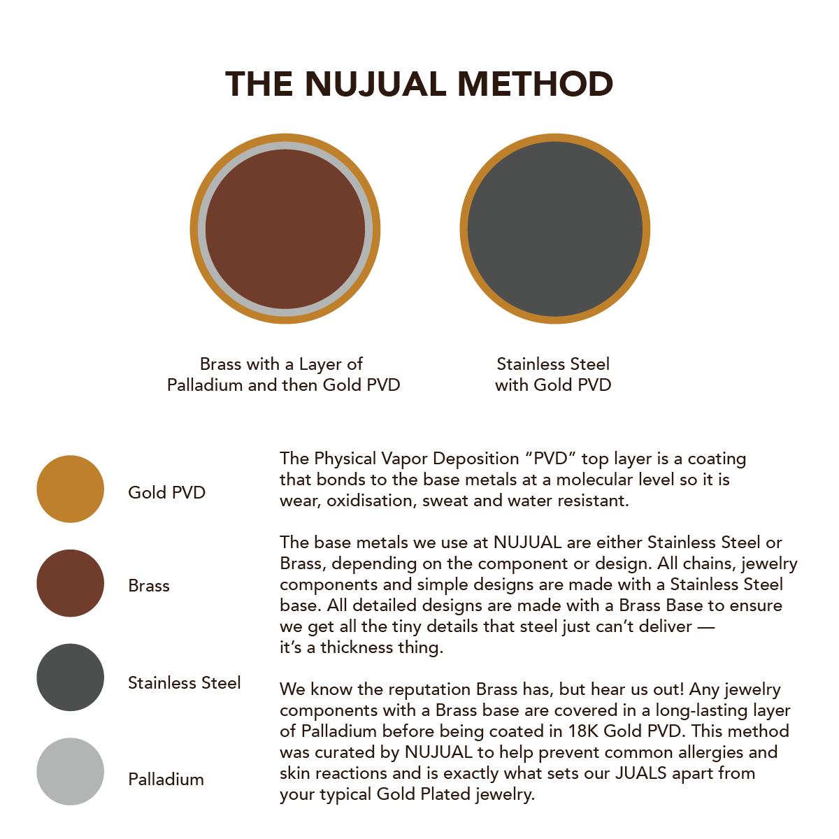 We know the reputation Brass has, but hear us out! Any jewelry components with a Brass base are covered in a long-lasting layer of Palladium before being coated in 18K Gold PVD. This method was curated by NUJUAL to help prevent common allergies and skin reactions and is exactly what sets our JUALS apart from your typical Gold Plated jewelry.